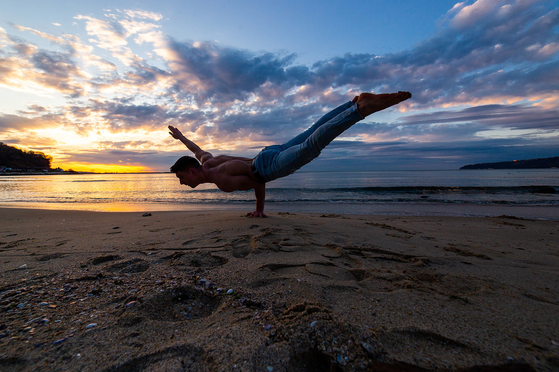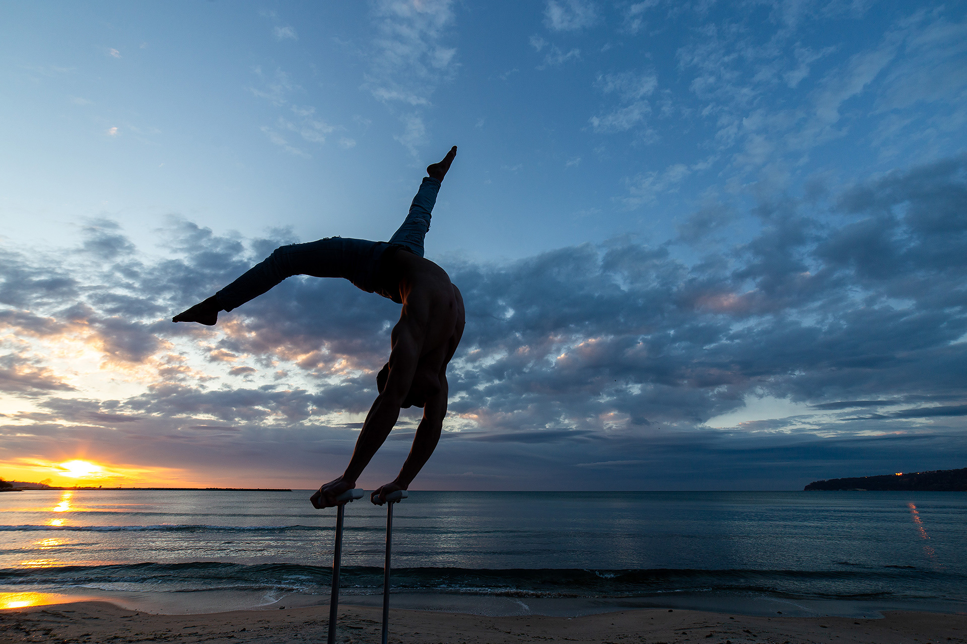 Алекс е цирков артист и акробат и мой приятел. Искаше да направим снимки по изгрев на плажа във Варна с акробатични пози.