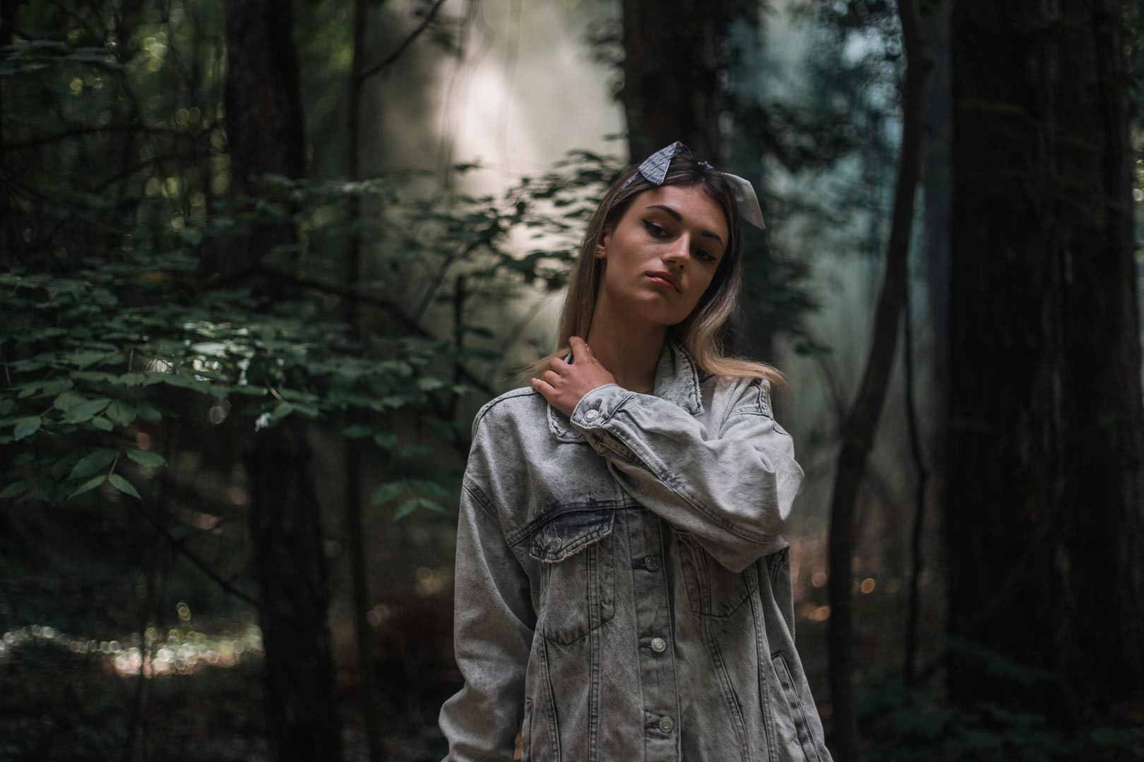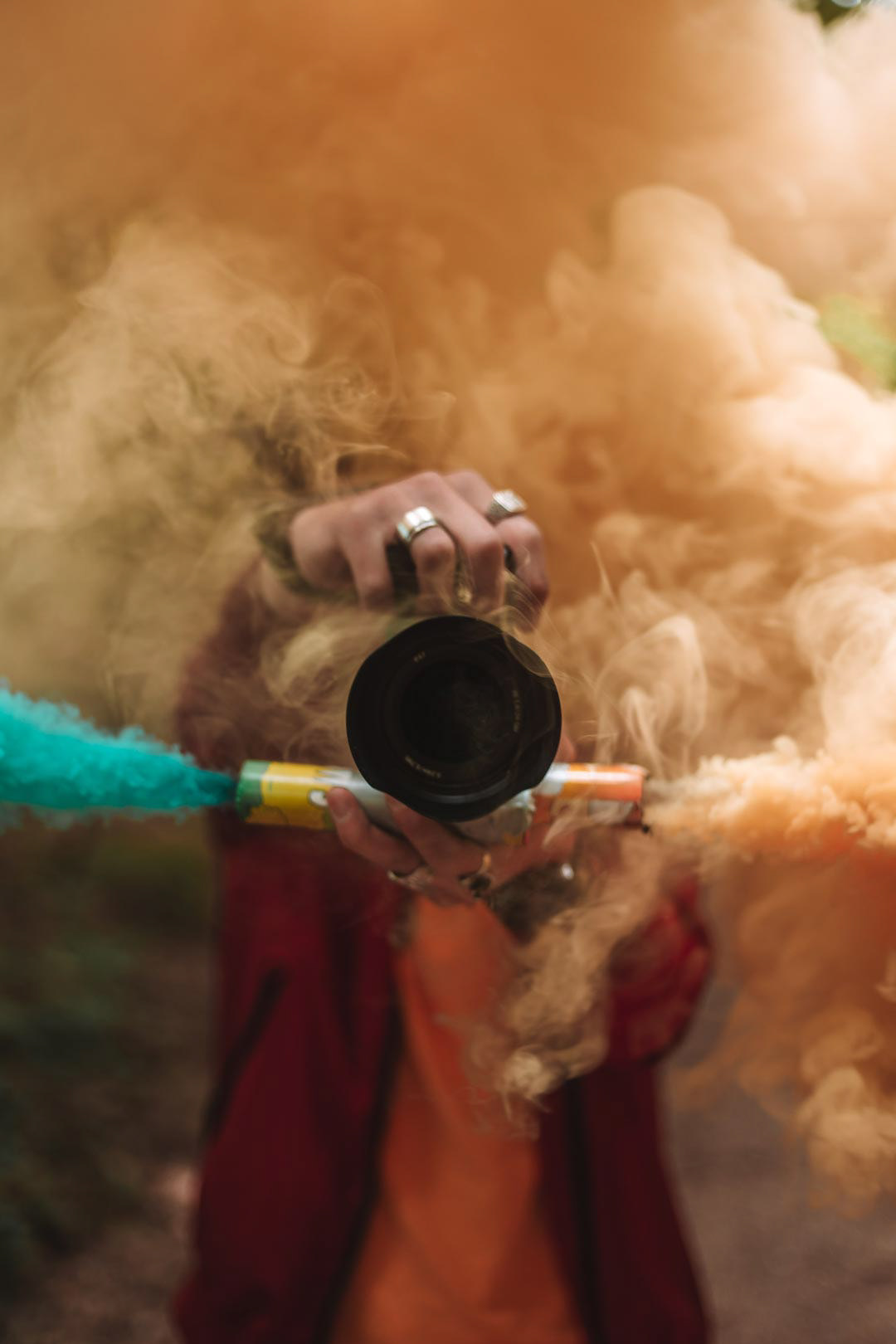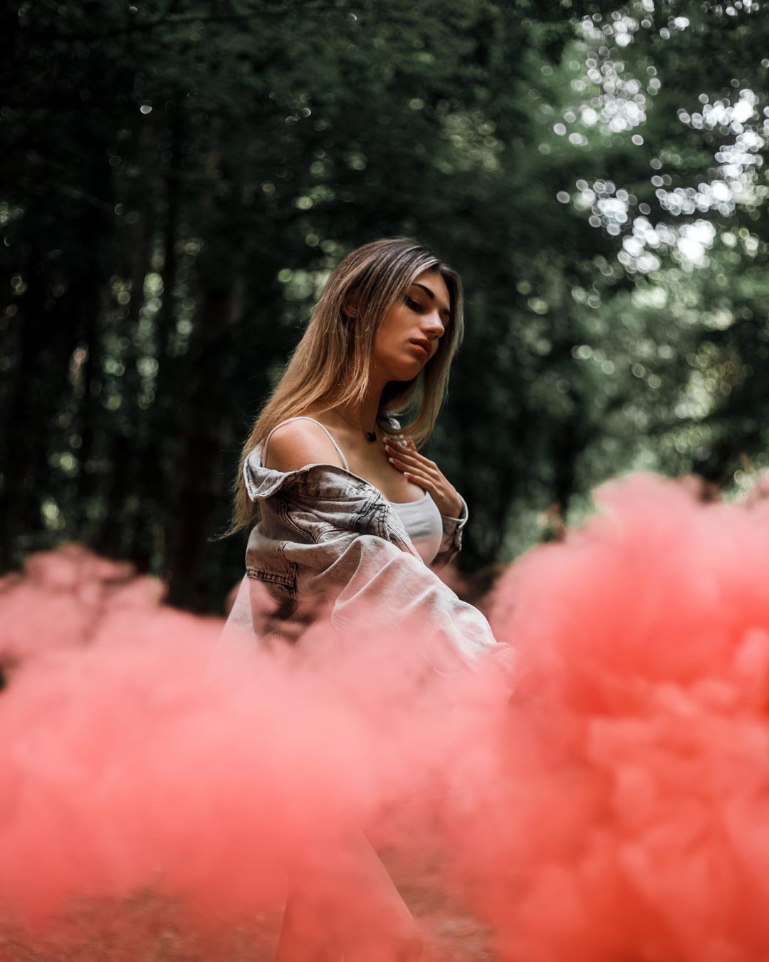 Даниел и Антония в изгубени в гората. Фотосесия с младата двойка бе интересно преживяване, защото успяхме да направим доста дълъг поход в търсене на перфектната локация за снимки. Трябваха ни достатъчно високи дървета и открито пространство за да има достатъчно място за ефектния цветен дим. Така се създаде илюзията за мъгла в гората.